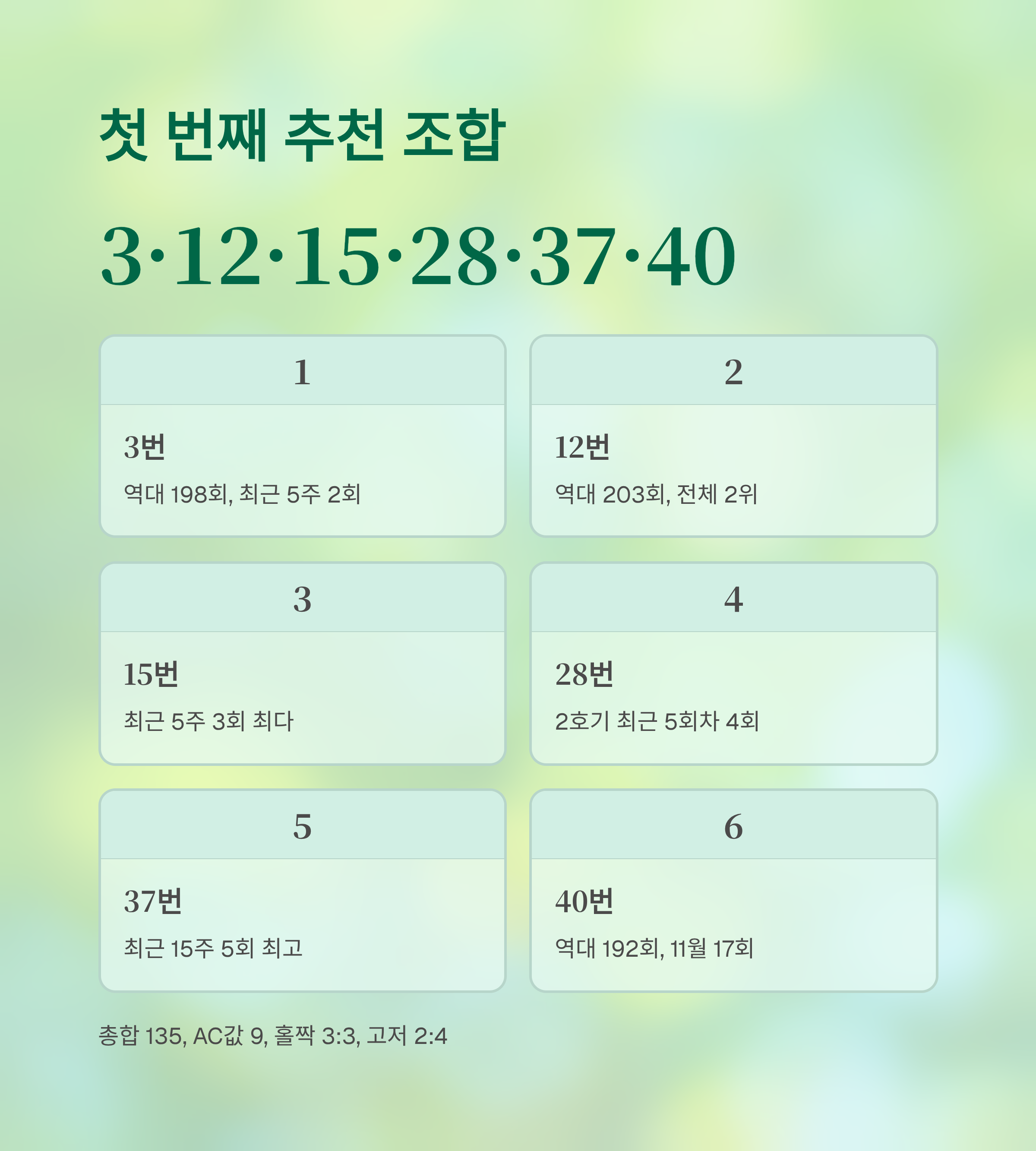 이 조합의 총합은 135로 권장 구간 101~176에 해당하며, AC값은 9로 역대 당첨번호 통계상 80% 빈도에 포함됩니다. 홀수 3개(3, 15, 37), 짝수 3개(12, 28, 40)로 균형이 맞습니다. 고저 비율은 저 2개(3, 12), 고 4개(15, 28, 37, 40)로 2:4 패턴입니다. 소수 2개(3, 37), 3의 배수 2개(3, 12, 15), 합성수 1개(28), 5의 배수 1개(40), 완전제곱수 1개(40)가 포함되어 통계적으로 안정적입니다. 연속번호는 없습니다.