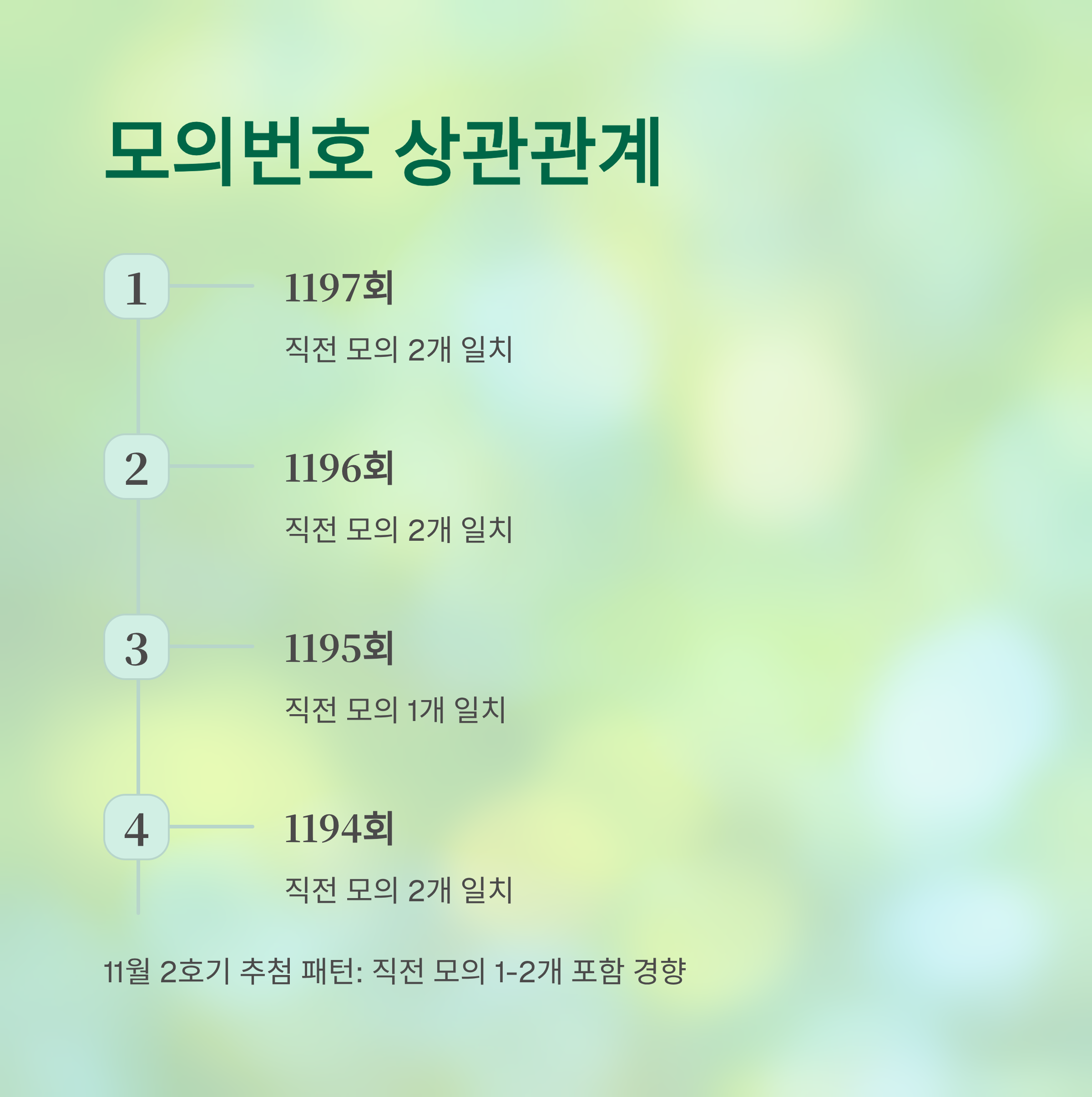 이러한 패턴을 분석하면 11월 2호기 추첨에서는 직전 모의번호가 1개에서 2개 정도 당첨번호에 포함되는 경향을 보입니다. 따라서 1197회 모의번호가 공개되면 그중에서 1개에서 2개를 선택하는 것이 유리합니다.