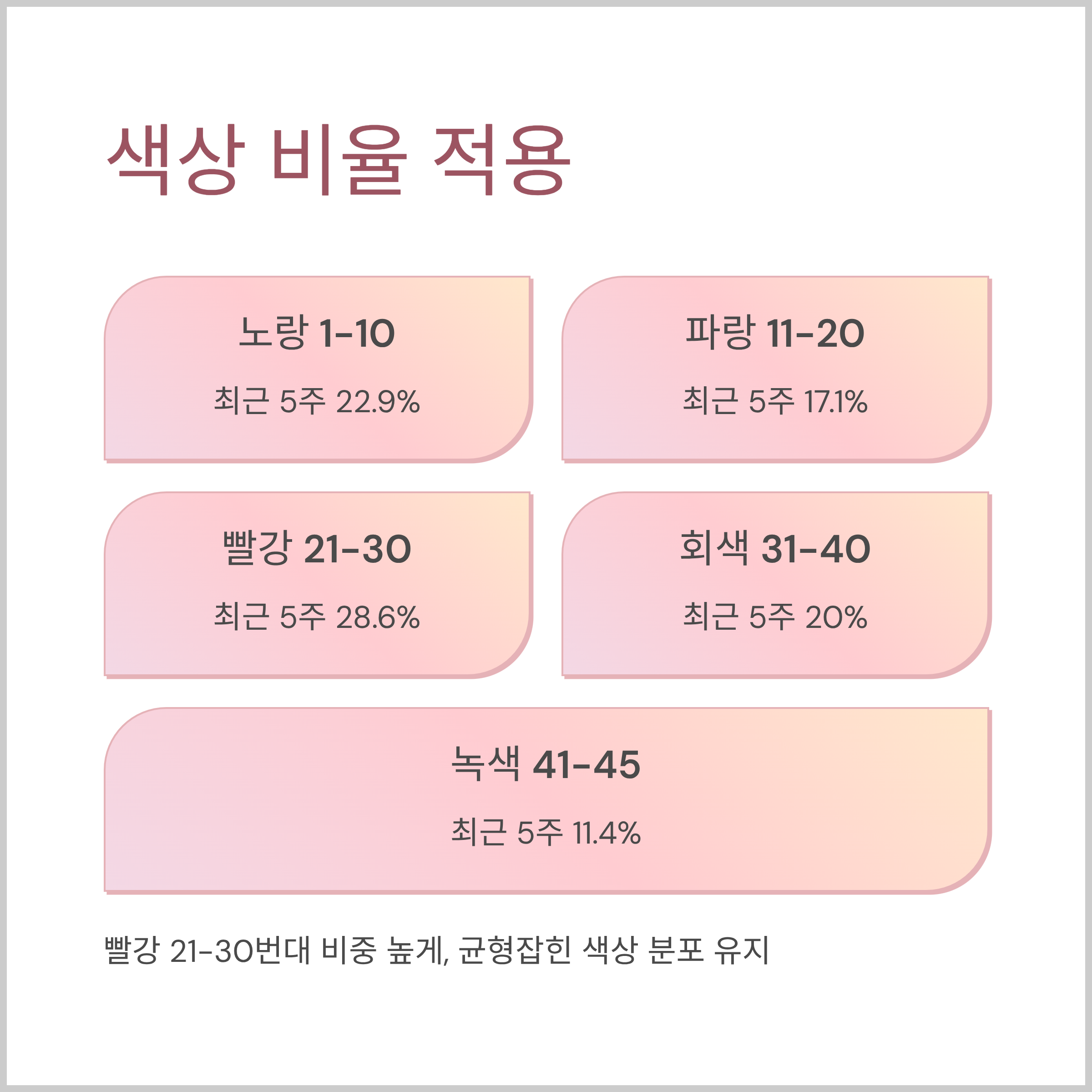 로또볼의 색상 비율도 중요한 분석 요소입니다. 1번부터 10번까지는 노랑색, 11번부터 20번까지는 파랑색, 21번부터 30번까지는 빨강색, 31번부터 40번까지는 회색, 41번부터 45번까지는 녹색으로 구분되는데요, 최근 5주간 색상 비율을 보면 노랑색 1번대가 22.9%, 파랑색 11번대가 17.1%, 빨강색 21번대가 28.6%, 회색 31번대가 20%, 녹색 41번대가 11.4%를 차지했습니다.