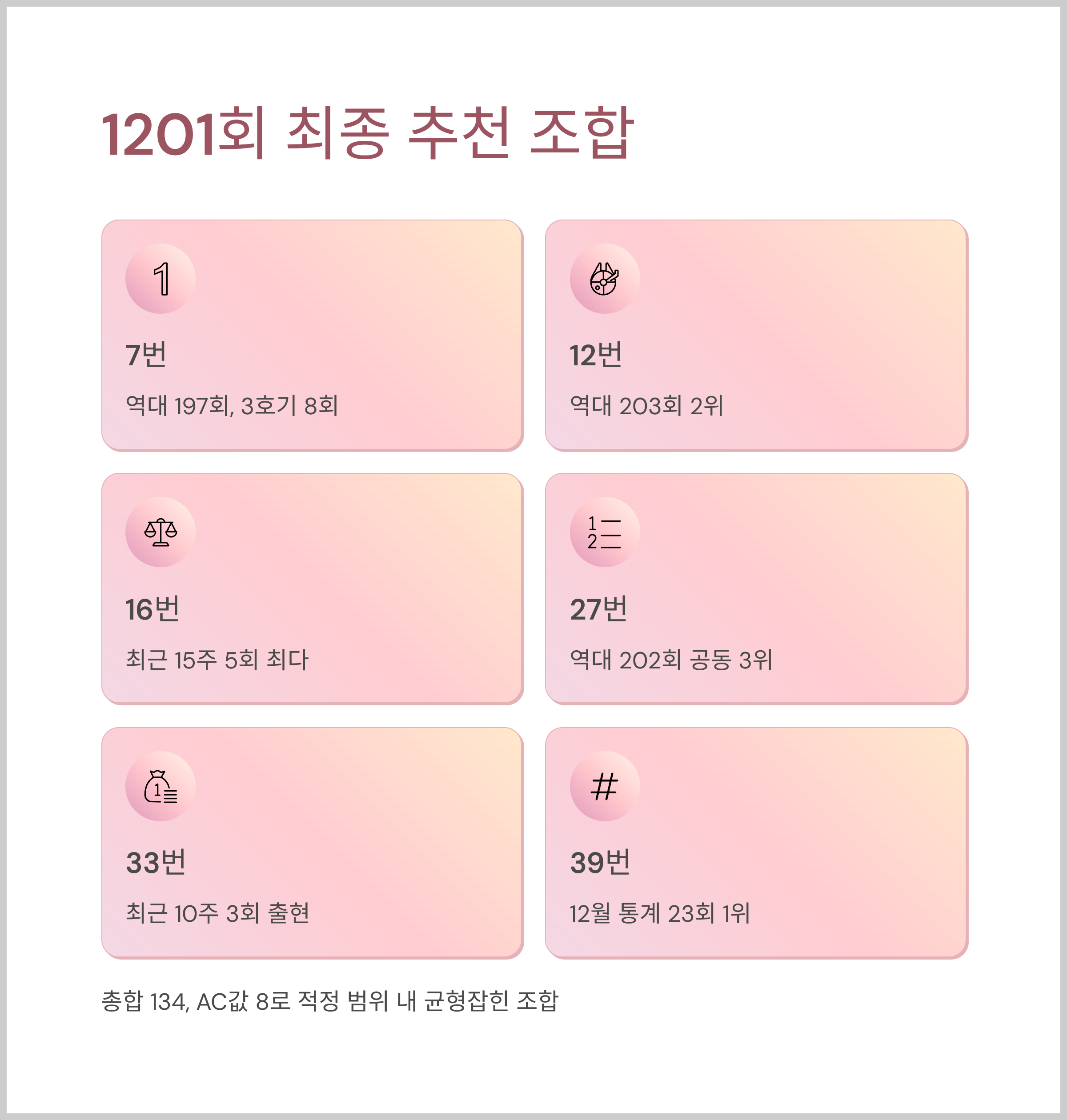 위의 모든 분석을 종합하여 1201회 최종 예상번호 조합을 제시해 드릴게요.