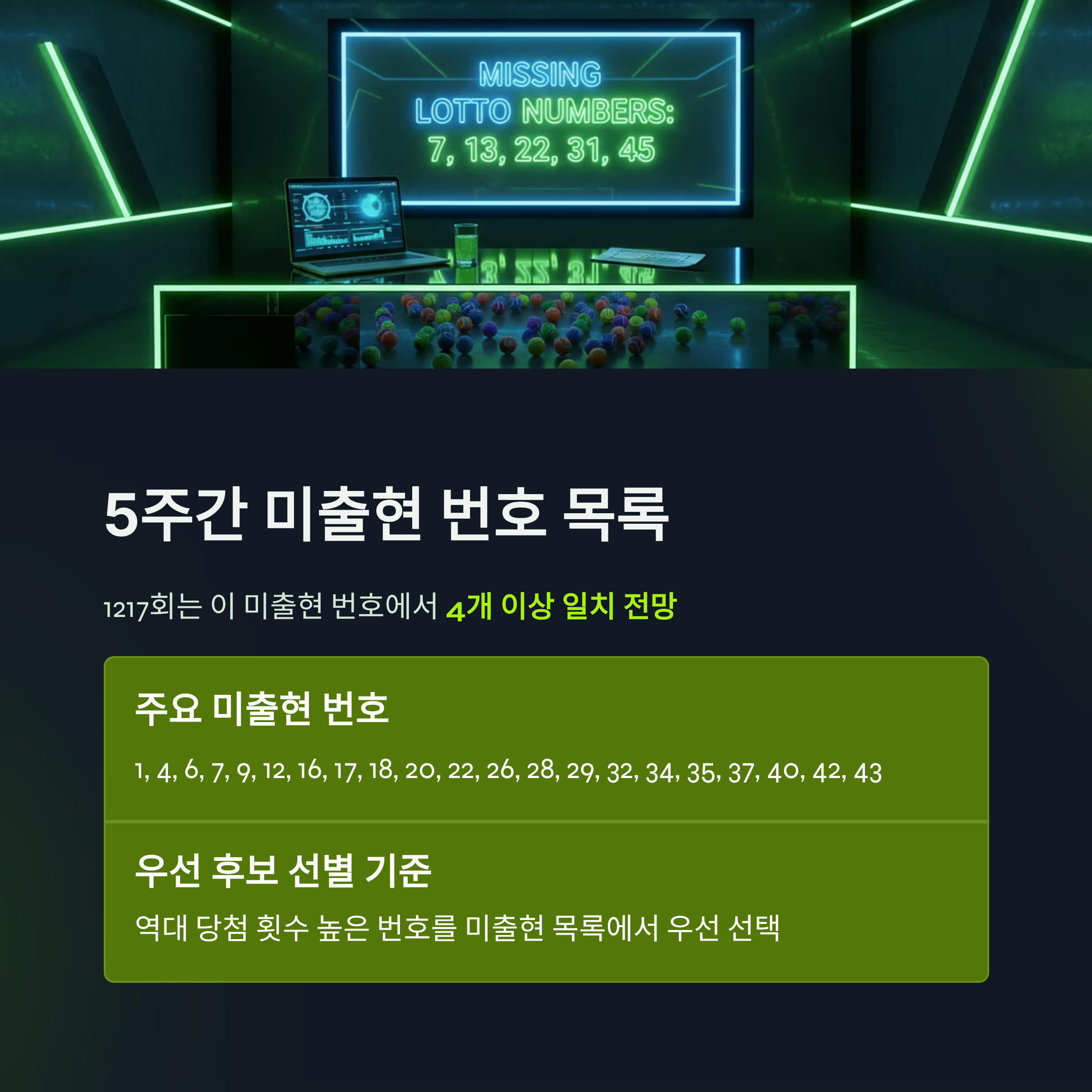 특히 이번 1217회는 5주간 미출현 번호에서 4개 이상 일치될 것으로 전망되고 있어서, 미출현 번호 분석이 어느 때보다 중요한 회차예요. 지금부터 차근차근 같이 분석해봐요!
